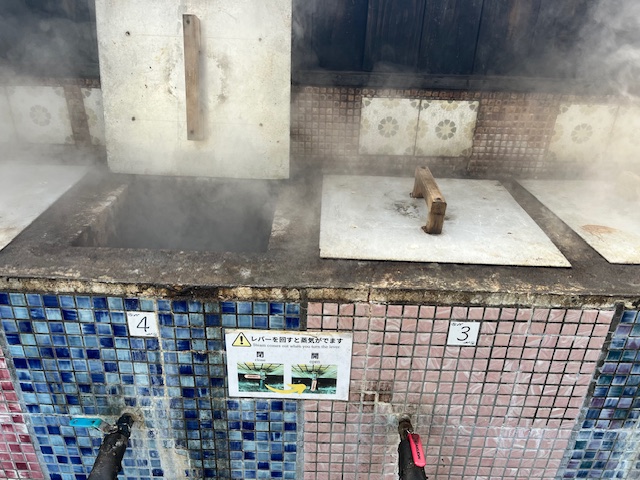 くぬぎ湯で貸切風呂後、朝ごはんに地獄蒸ししてきましたよ~。