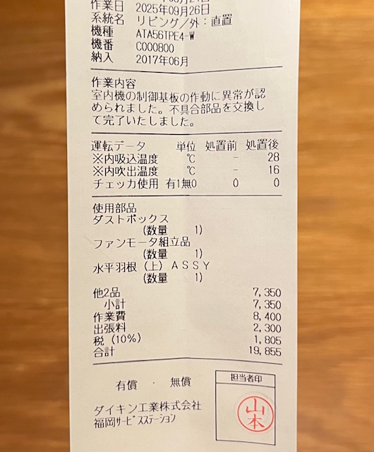 今回の修理でかかった費用は、19,855円(部品代+出張費+作業費)。