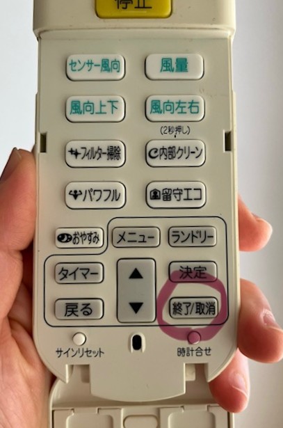 エアコンの電源ランプが点滅してるときに赤丸の終了ボタンを長押し。
