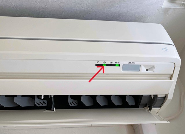 リモコンで電源いれてしばらくすると、電源ランプ(矢印)が点灯して、運転停止。