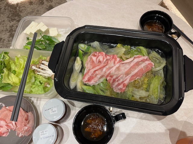 ホットプレートにだし(だしパックです(笑)を張って、たっぷりの野菜と一緒にしゃぶしゃぶ。